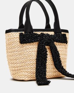 Expertly crafted. the BOWW bag is a mini tote bag with top handles and a detachable crossbody strap for easy carrying. It features an eye-catching embellished beaded bow decal on the front and a magnetic snap closure for security. The interior pouch on the back wall provides additional organization options. Elevate your style and stay organized with this versatile bag.