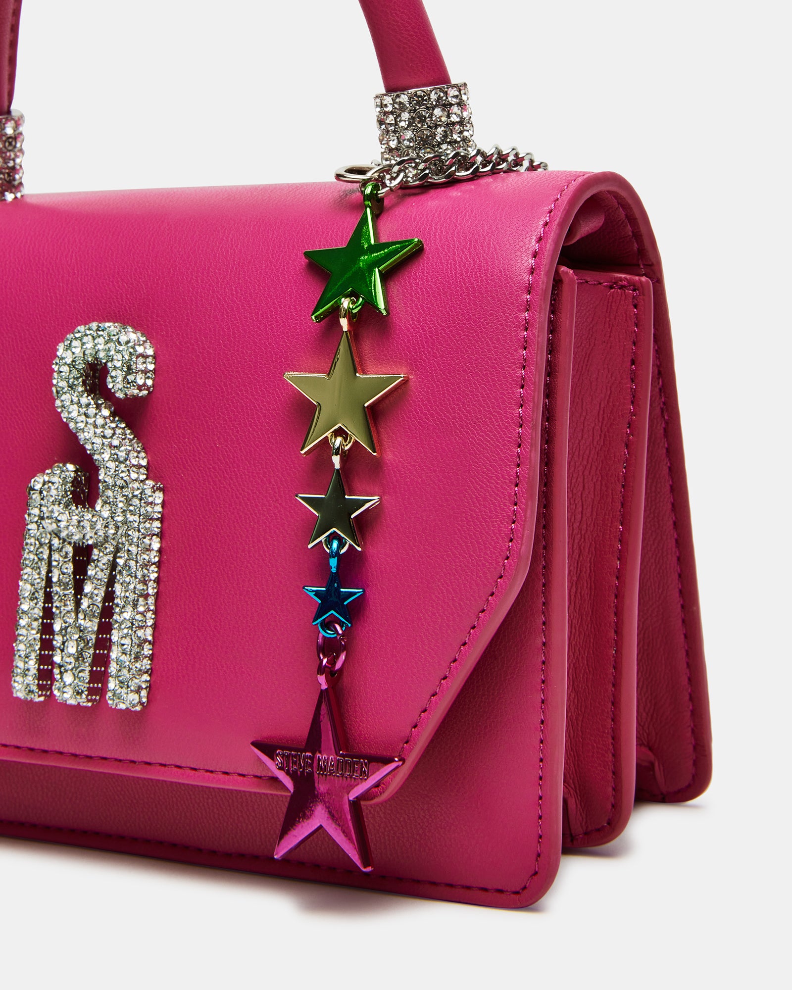 The BRAT mini bag features a top handle and a multi-colored star charm with bubble letter logo letters for a trendy look. With a crossbody strap and interior back wall. it offers convenience and organization while making a stylish statement.