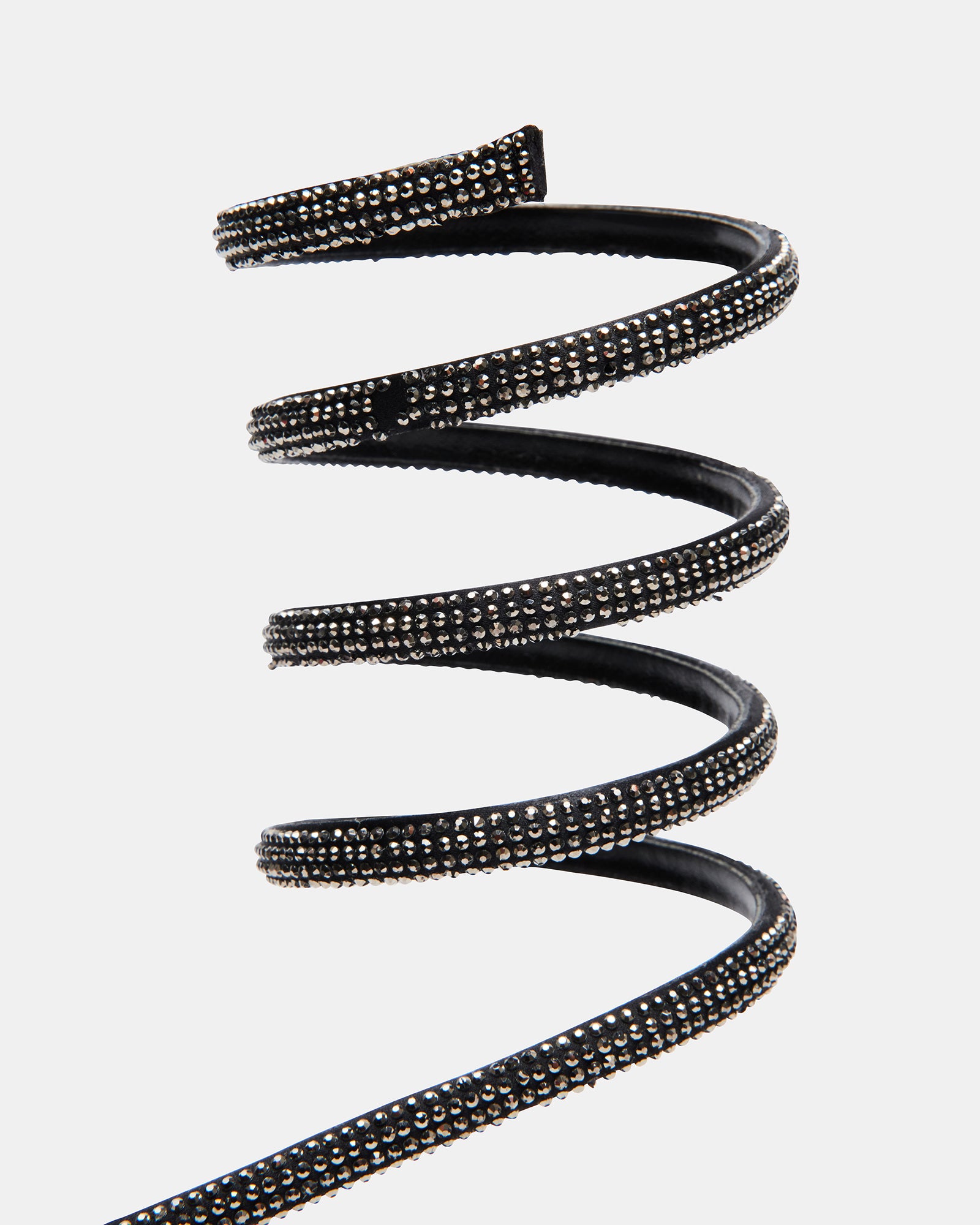 The EMERSON stiletto pump features a point toe and open back secured with a coiled ankle strap. Tiny rhinestones set around the welt of the toe and on the ankle strap add subtle sparkle to your step.