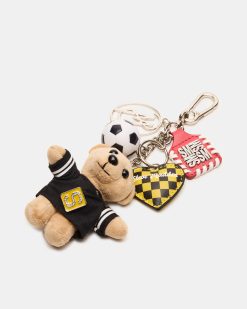 Add a playful touch to your bag with our attachable GOAL BAG CHARM. This charming features a stuffed bear with a soccer ball . accompanied by a metal logo and puff checkered heart charm. The dog clip attachment ensures secure placement.