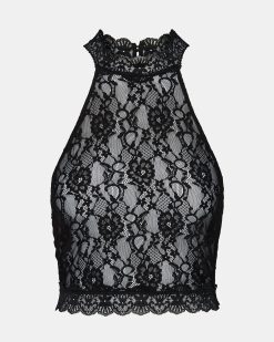 The JUDY TOP BLACK features a lace mesh design with a halter neckline and cropped fit. offering a sophisticated yet edgy style. Crafted from delicate mesh fabric with intricate lace details. this provides breathability and a refined texture. Its halter cut enhances the shoulders and neckline. making it perfect for layering or wearing solo for a statement look. Ideal for pairing with tailored pants or skirts to elevate evening and casual ensembles.