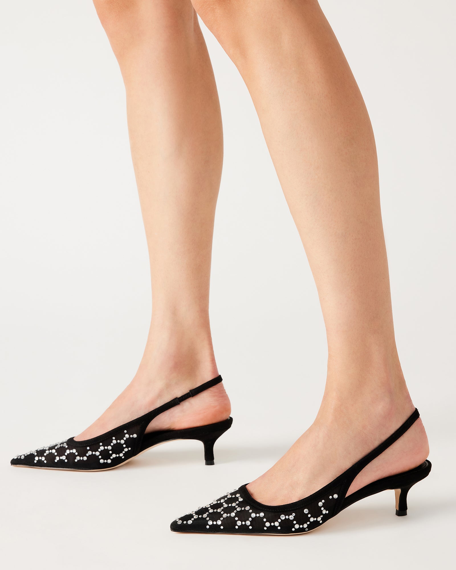 The KARI features a point toe. a low kitten heel. and a slim strap for a sleek and streamlined silhouette.