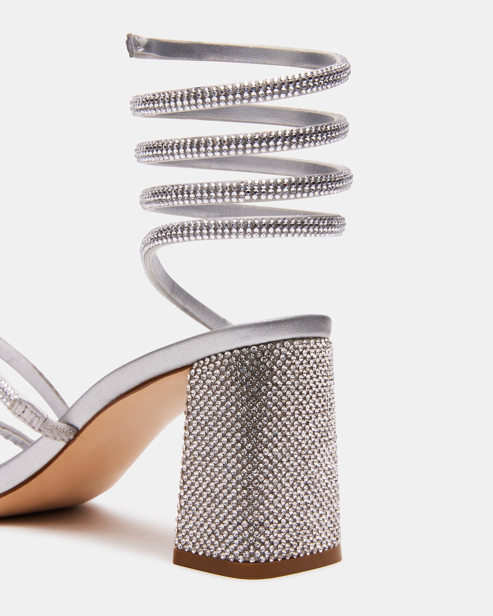 Dimensional tubular straps crossed over the foot and coiled around the ankle secure the LOPEZ sandal to a square toe sole with a block .