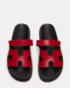 The leather MAYVEN feature comfy construction details like a molded footbed. a treaded flatform sole. and an adjustable top strap. plus a front strap with a geometric cutout design.