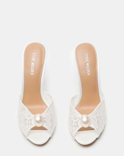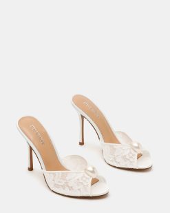 The PRIYA PEARL WHITE LACE sandal pairs a slender stiletto with a retro-inspired peep toe design on the slide strap at the front.