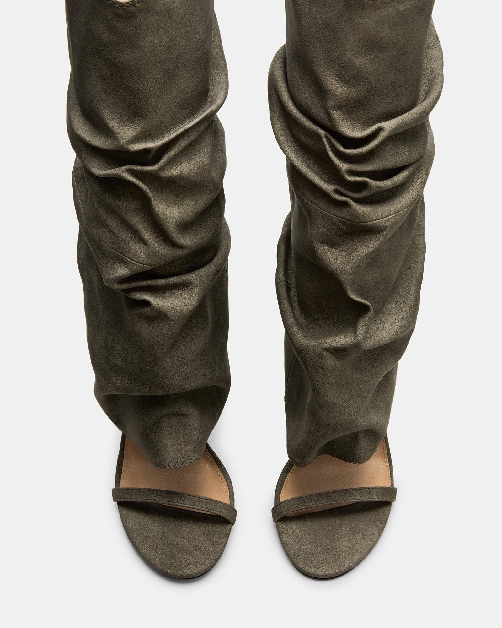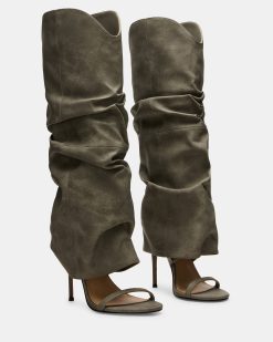 Expertly crafted and designed. the RAVINE cuffed knee-high features an open toe and stiletto heel for a stylish touch. The rounded toe provides comfort while the sleek design adds a touch of sophistication. Elevate your look with this must-have boot.