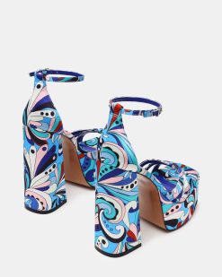 The RETRO BLUE PRINT showcases a classic design paired with a block heel for enhanced balance and comfort. Its open toe offers breathability and style. while the adjustable ankle strap ensures a secure fit. This combination delivers both elevated height and lasting support. making it the perfect for those seeking a refined look.