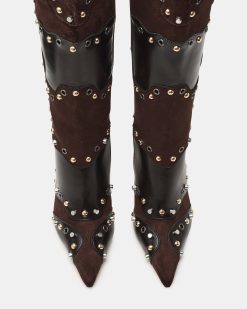Elevate your style with the REVIVE BROWN MULTI . a knee-high stiletto featuring a pointed-toe and distinctive studded detailing. Crafted for a sleek. confident look. this boot combines edgy accents with a refined silhouette. perfect for making a bold statement while maintaining elegance. Ideal for fashion-forward wearers seeking both sophistication and attitude in their footwear.