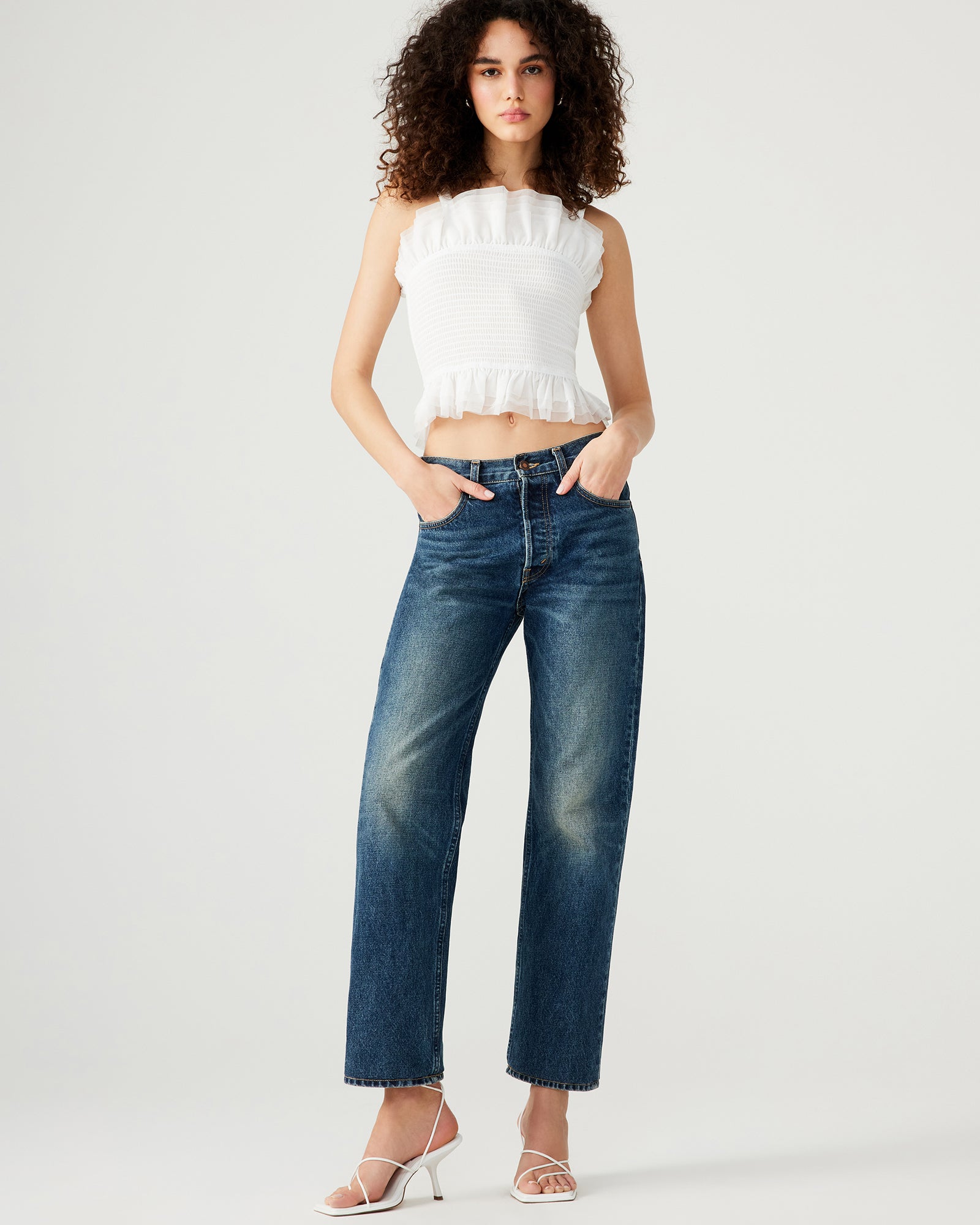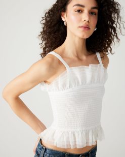 Crafted from delicate tulle. the RHIANNON showcases a smocked design that adds texture and dimension to this timeless piece. Complete with a whimsical ruffle neckline and hem. this top also features nonadjustable straps for a secure and comfortable fit. The perfect addition to your wardrobe for a touch of elegance.