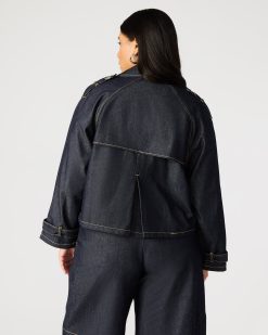 Enhance your wardrobe with the SIRUS denim . This cropped trench boasts a double-breasted design and features two functional side pockets. The two wind flaps provide added functionality while the shoulder epaulettes and sleeve cuff belts add a touch of style. Complete with a pleated back flap. this jacket is both practical and chic.