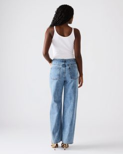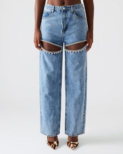 The TAYLOR offer a stylish twist on a classic design. Boasting a wide-leg fit. these jeans provide comfort and versatility. while the intricate rhinestone trim cutouts at the thighs add a touch of glamour.