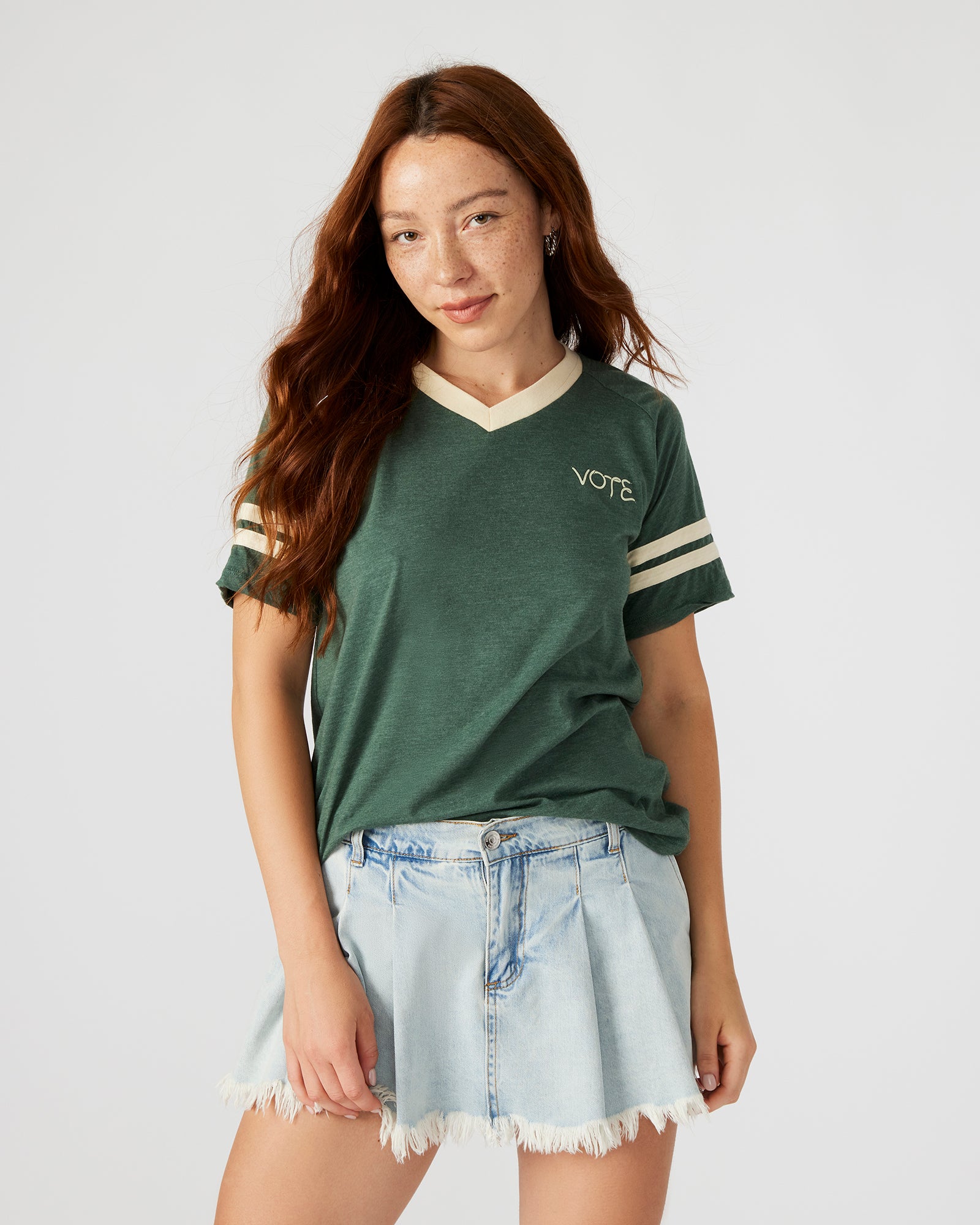 Enhance your wardrobe with our VOTE . With a comfortable short-sleeved v-neck design and contrast color neckband and sleeve bands. you’ll make a stylish statement while promoting democracy. The added locker loop at the back neck allows for easy hanging. making it a versatile and convenient addition to your collection.