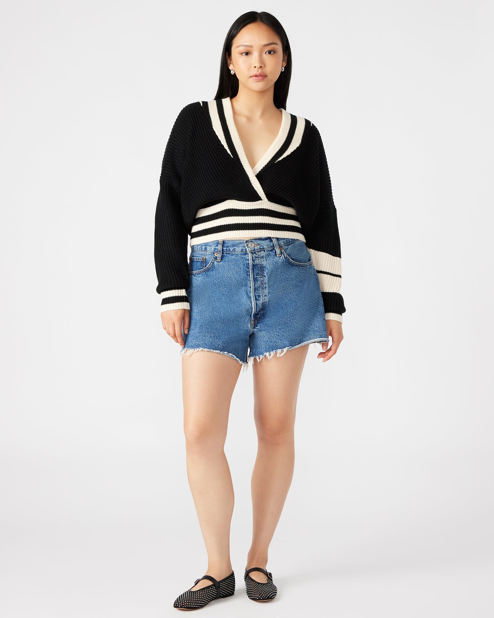 Accented with varsity-inspired striping. ADDISON is a versatile pullover with a faux wrap that you can wear on or off the shoulders.