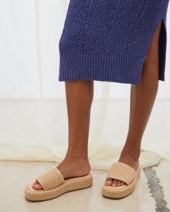 The BEACHY square toe secured a woven raffia wrapped flatform sole with a matching wide slide strap for a super comfy textured look.