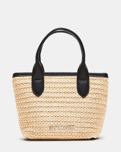 Expertly crafted. the BOWW bag is a mini tote bag with top handles and a detachable crossbody strap for easy carrying. It features an eye-catching embellished beaded bow decal on the front and a magnetic snap closure for security. The interior pouch on the back wall provides additional organization options. Elevate your style and stay organized with this versatile bag.