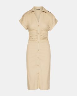 The CAMBRIE is a must-have for any wardrobe. Made with slub stretch linen fabric. this midi shirt dress boasts Dolman sleeves and ruched detailing for a flattering fit. With its versatile blush color and elegant rolled sleeves. this dress is perfect for any spring occasion.