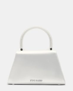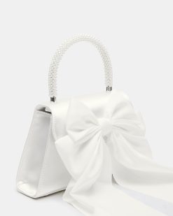 Introducing the sophisticated COSETTE bag. Expertly crafted with smooth satin and a beaded top handle. this elegant bag features a long satin bow and a structured top handle for a touch of glamour. The interior back slit pocket and detachable chain strap add practicality to its angled. trapezoid silhouette. Perfect for any formal occasion. this bag is a must-have for the style-conscious individual.