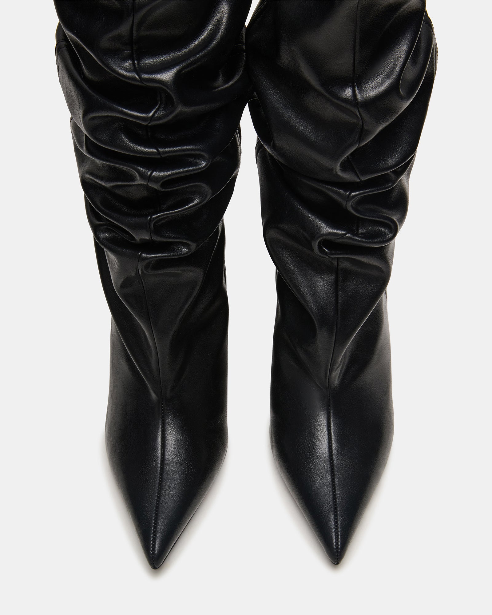 The DISTORTION features a scrunched design. wedge heel. and a pointed-toe. extending to knee height for a bold. fashion-forward silhouette. Crafted to combine edgy style with comfortable wear. this boot elevates any outfit with its sleek design and distinctive wedge support. Ideal for those seeking a statement piece that balances trend and practicality.