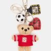 Add a playful touch to your bag with our attachable GOAL BAG CHARM. This charming features a stuffed bear with a soccer ball . accompanied by a metal logo and puff checkered heart charm. The dog clip attachment ensures secure placement.