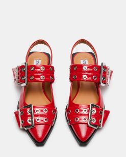 The GRAYA slingback have an angular silhouette with a square back and a snipped toe. Chunky grommets and oversized buckles give an edge to the wide straps over the top and the toe of this design.