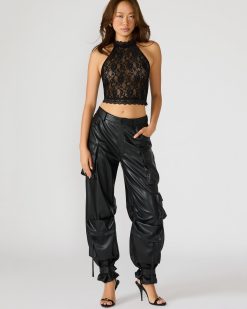 The JUDY TOP BLACK features a lace mesh design with a halter neckline and cropped fit. offering a sophisticated yet edgy style. Crafted from delicate mesh fabric with intricate lace details. this provides breathability and a refined texture. Its halter cut enhances the shoulders and neckline. making it perfect for layering or wearing solo for a statement look. Ideal for pairing with tailored pants or skirts to elevate evening and casual ensembles.