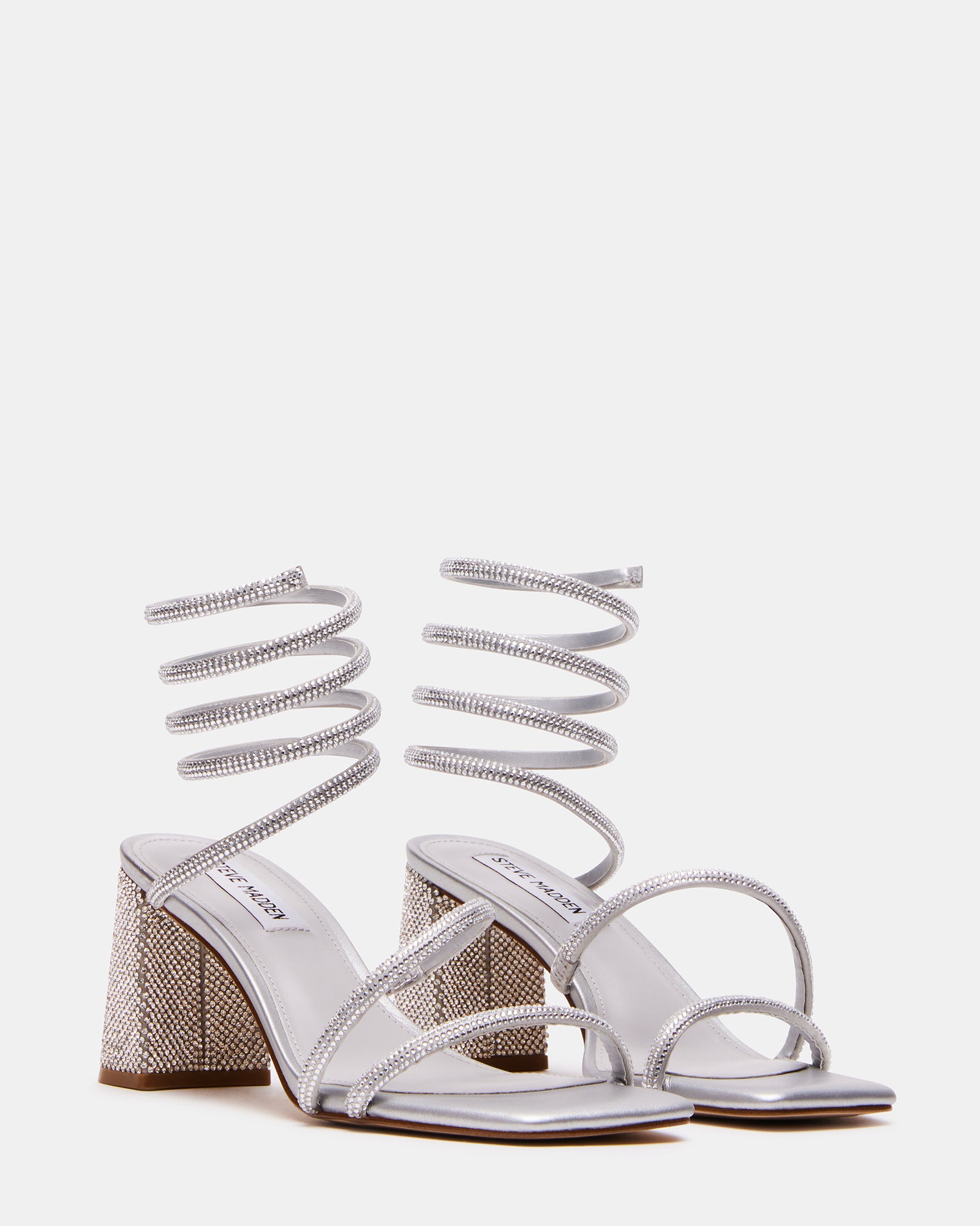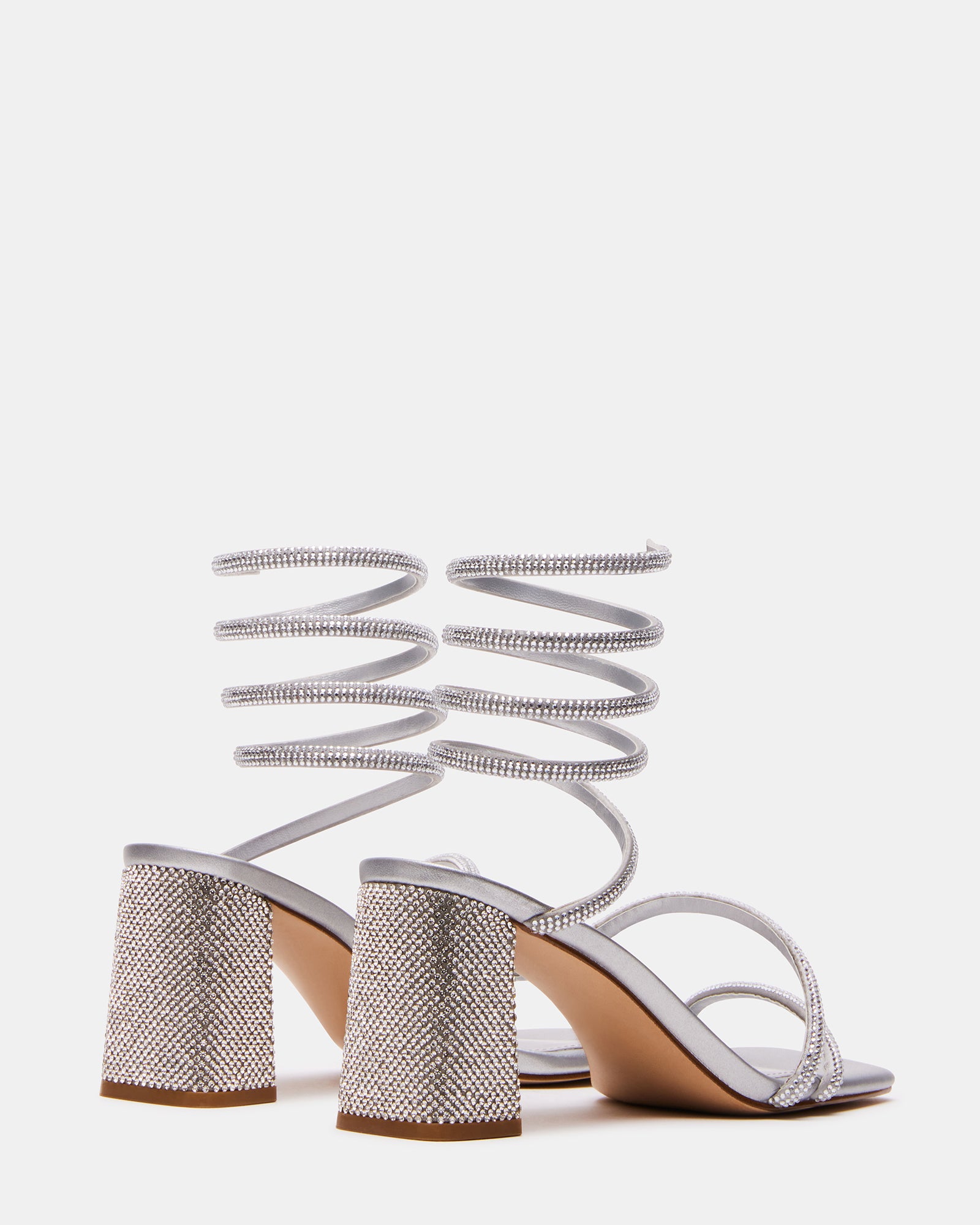 Dimensional tubular straps crossed over the foot and coiled around the ankle secure the LOPEZ sandal to a square toe sole with a block .