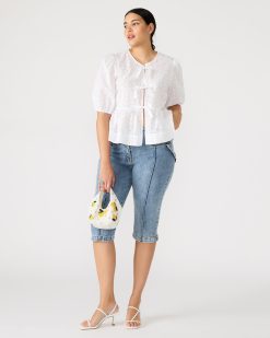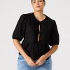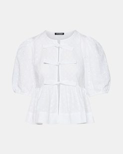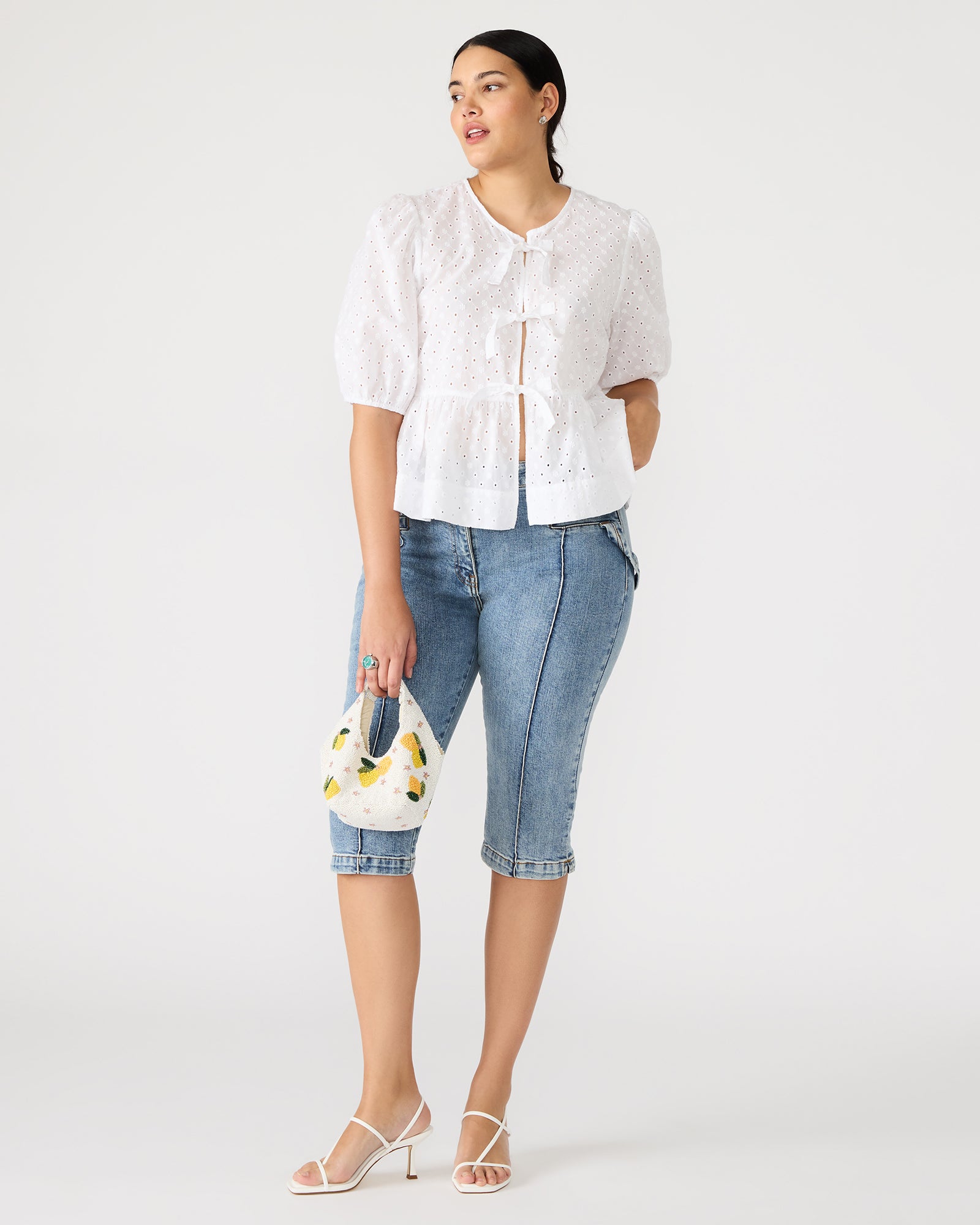 The PAULA features stylish short-sleeved puff sleeves and a tie-front detail. accented by delicate eyelet detailing. This top offers a chic. modern look perfect for any occasion.