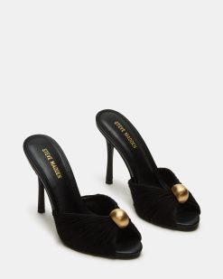 The PRIYA sandal pairs a slender stiletto with a retro-inspired peep toe design on the slide strap at the front.