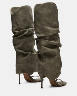 Expertly crafted and designed. the RAVINE cuffed knee-high features an open toe and stiletto heel for a stylish touch. The rounded toe provides comfort while the sleek design adds a touch of sophistication. Elevate your look with this must-have boot.