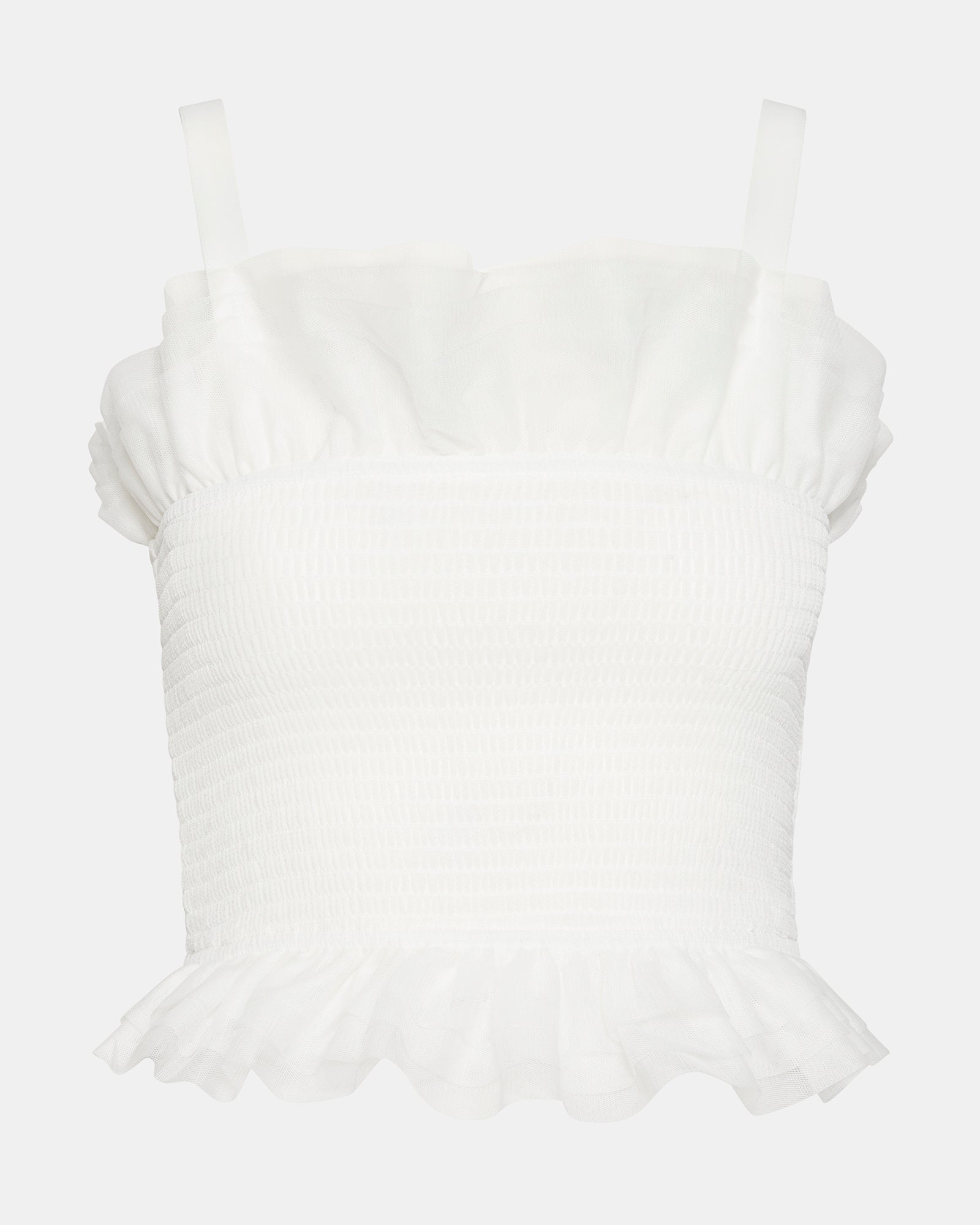 Crafted from delicate tulle. the RHIANNON showcases a smocked design that adds texture and dimension to this timeless piece. Complete with a whimsical ruffle neckline and hem. this top also features nonadjustable straps for a secure and comfortable fit. The perfect addition to your wardrobe for a touch of elegance.