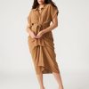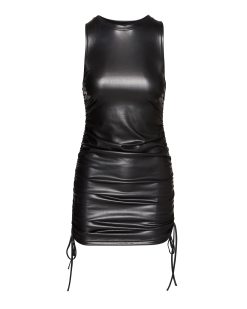Faux real. babe. This vegan leather mini dress features ruched details with adjustable side ties.