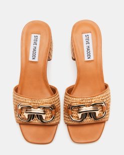 The SANTANA block highlights contrasting textures with woven raffia accents and chunky chain hardware across the top of the slide strap.