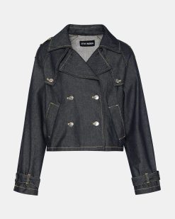 Enhance your wardrobe with the SIRUS denim . This cropped trench boasts a double-breasted design and features two functional side pockets. The two wind flaps provide added functionality while the shoulder epaulettes and sleeve cuff belts add a touch of style. Complete with a pleated back flap. this jacket is both practical and chic.